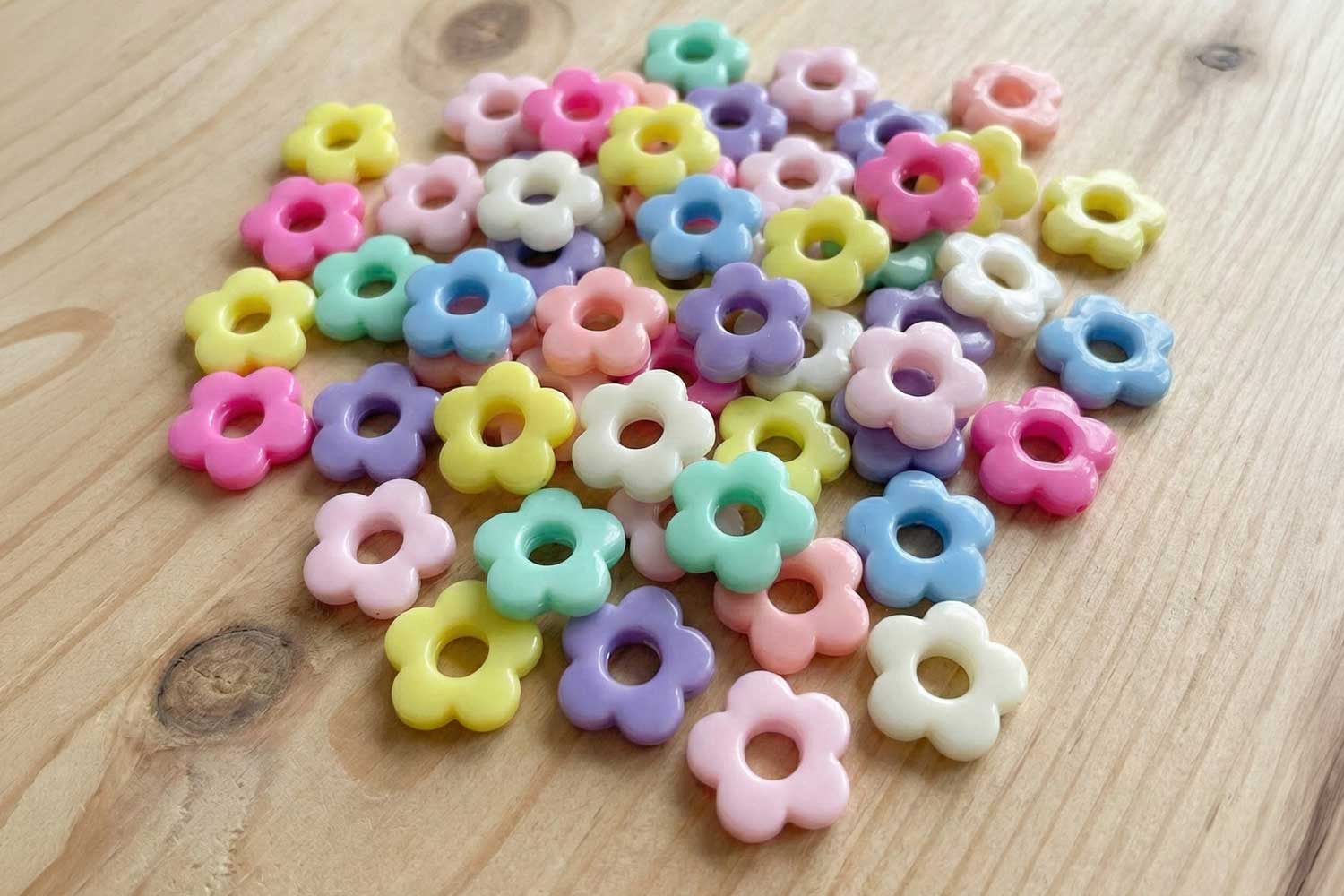 Perles en acrylique opaques, forme fleur marguerite. Ces ravissantes petites fleurs d'environ 2 cm, sont dotées d'un trou central large pour faciliter le passage de vos fils, rubans ou élastiques. Le sachet comprend un mélange harmonieux de nuances douces et vitaminées, incluant le rose pastel, le jaune soleil, le bleu ciel, le violet, le vert menthe et le blanc. Ce sachet généreux d'environ 40 pièces vous offre une multitude de possibilités pour confectionner des cadeaux uniques pour vos proches ou pour développer votre petite activité artisanale locale.