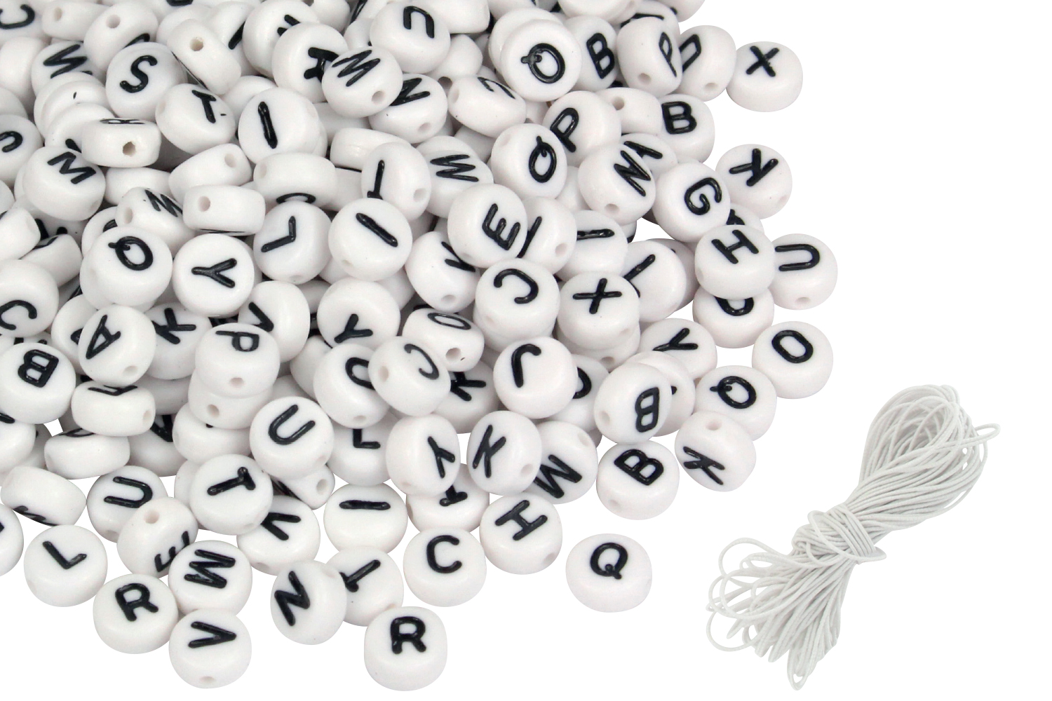 Perles rondes et plates alphabet livrées avec 5 mètres de fil élastique.