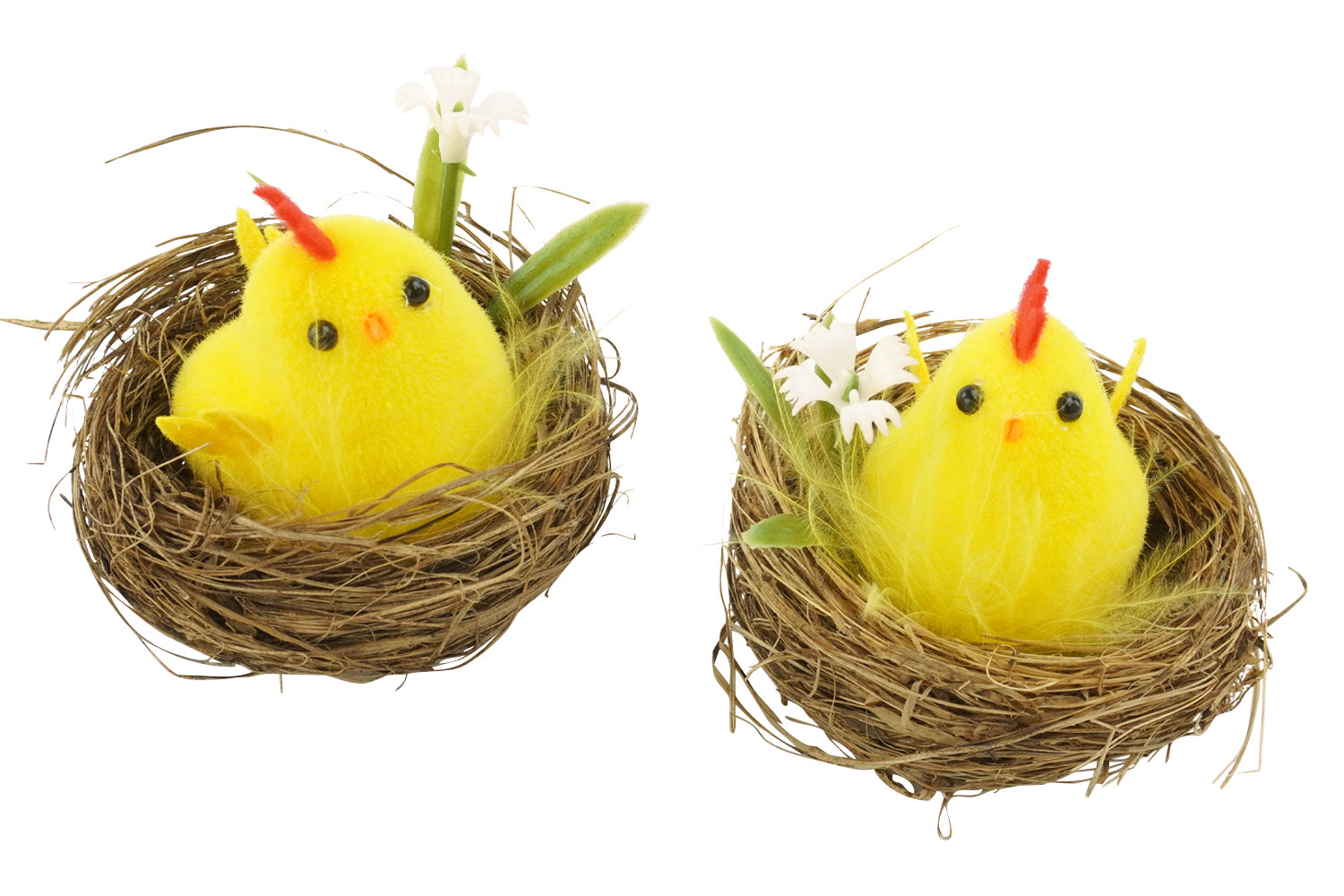 Ces charmants petits poussins en pompon, confortablement installées dans leur nid naturel agrémenté de fleurs et de feuillage, sont l’élément idéal pour vos décorations de Pâques et vos créations printanières. Un duo adorable pour célébrer le printemps et égayer vos créations !