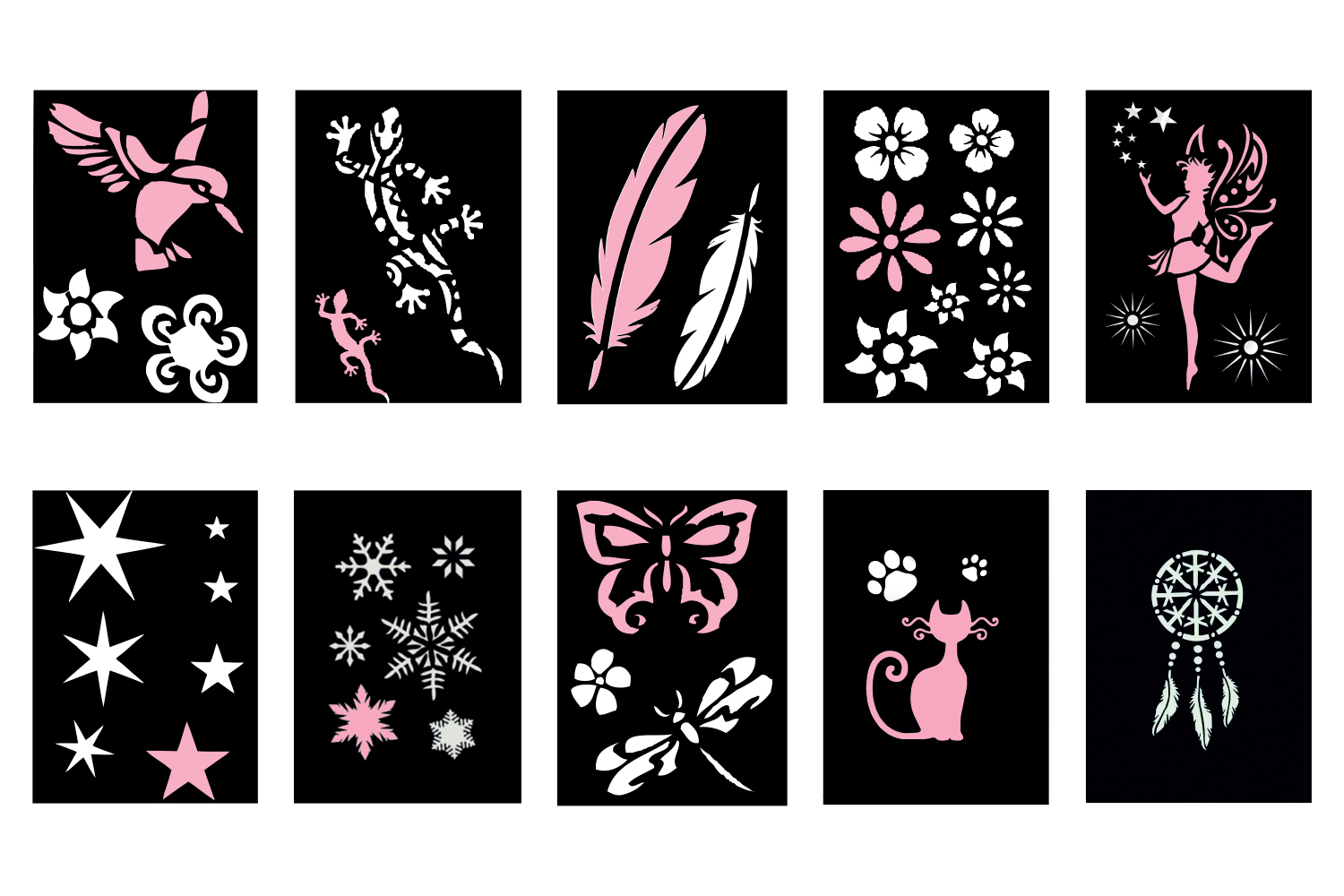 Pochoirs adhésifs souples vous pour reproduire parfaitement des dessins à la peinture ou en traçant juste les contours sur le support de votre choix. Grâce à une face collante, ils adhèrent sur les surfaces en tissu, verre, miroir, porcelaine, bois, polystyrène, plastique... Très pratique, la technique du pochoir s’utilise à tout âge !