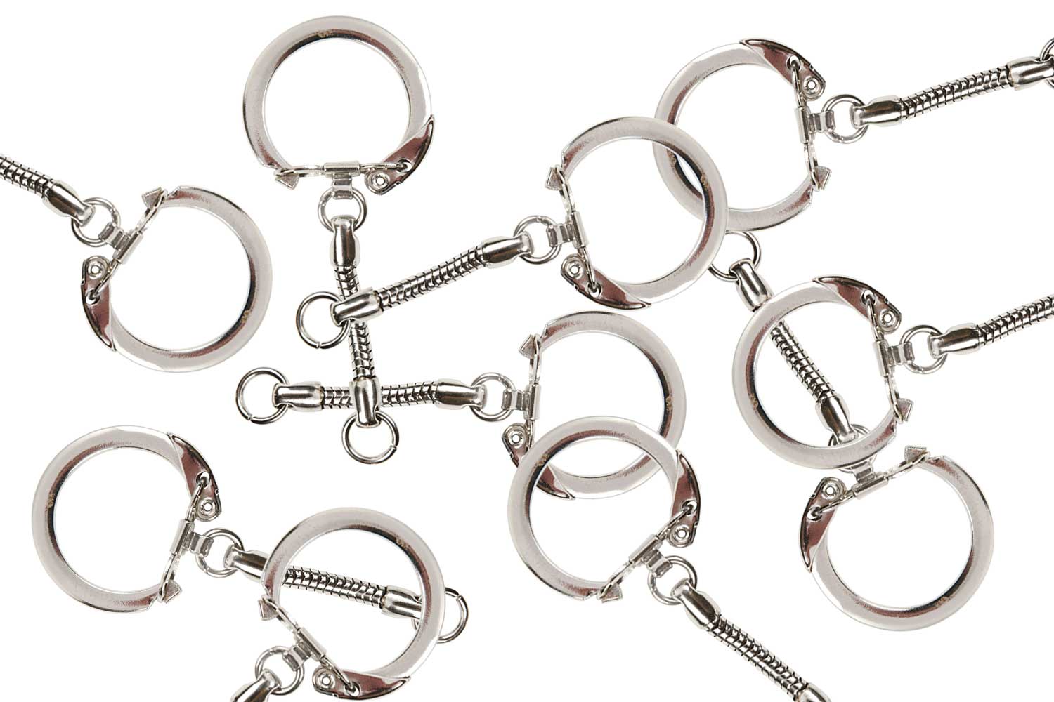 Porte-clés à clip en métal argenté, avec chaînette et anneau en terminaison pour accrocher des perles, une réalisation en plastique magique, des pompons, grelots... Idéal pour la fabrication de porte-clés personnalisés.