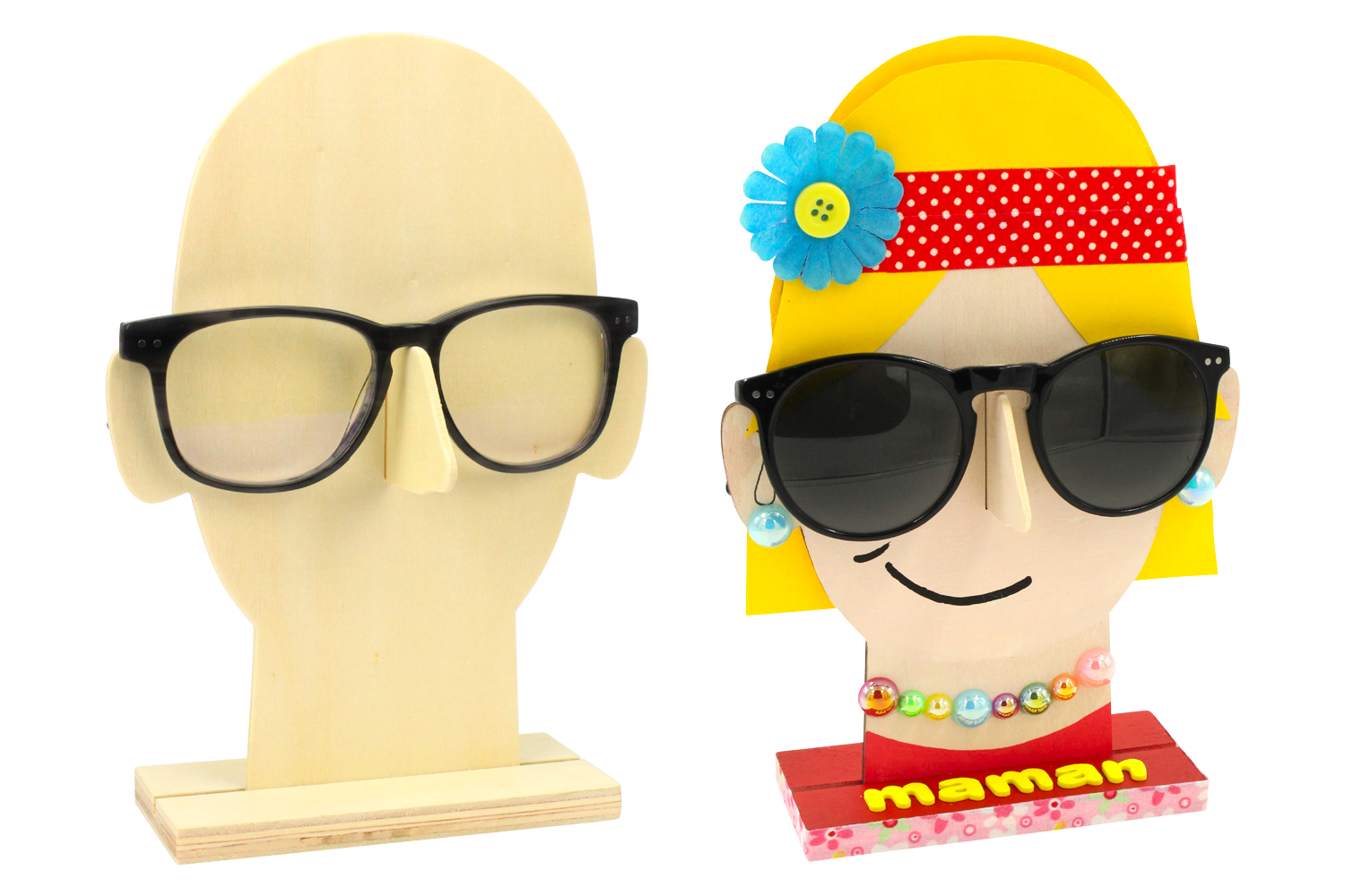 Porte-lunettes en bois naturel, livré à plat en 3 parties (socle, visage et nez).