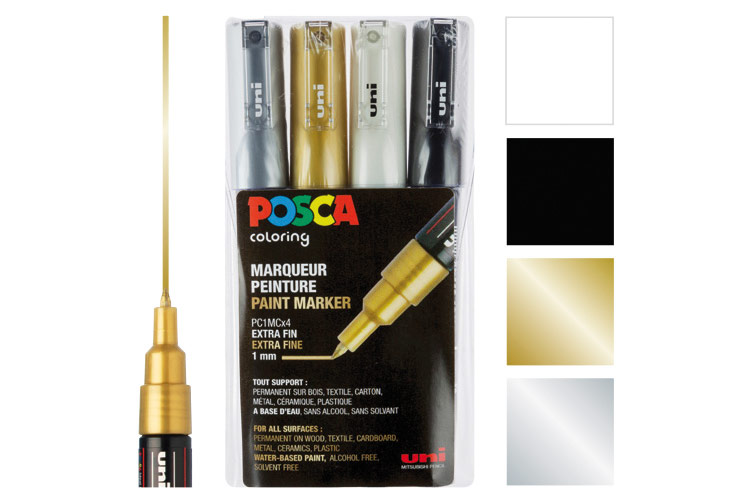 Ce set Posca PC-1M regroupe 4 marqueurs à pointe conique extra-fine (0,7 - 1 mm) dans une sélection de teintes essentielles et précieuses. Conçu pour les travaux de détail et de finition, il offre la qualité de peinture acrylique Posca dans un format compact et maniable. La pointe PC-1M est l'outil de précision par excellence de la gamme, elle permet de réaliser des lignes nettes, des pointillés et des hachures avec une grande régularité. Parfaite pour les écritures fines, les motifs complexes et les travaux de minutie sur de petites surfaces.