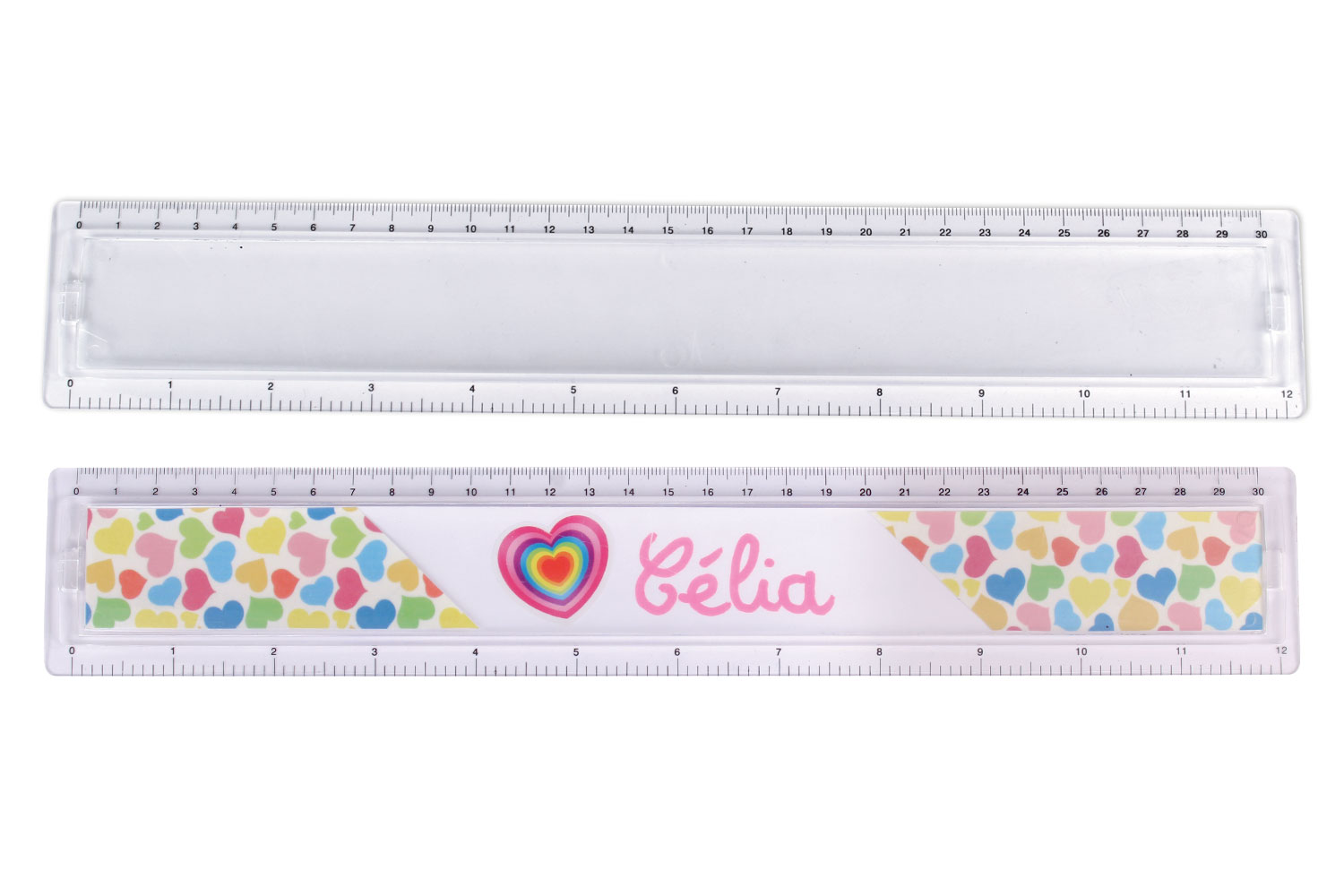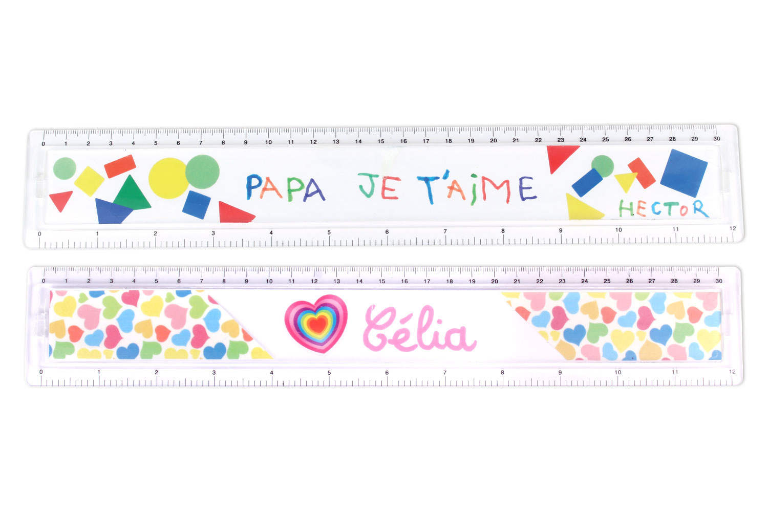 Règle graduée (30 cm) en plastique transparent résistant, livrée avec une bande pré-découpée de papier dessin blanc à décorer… puis à intégrer, dans le compartiment intérieur de la règle.