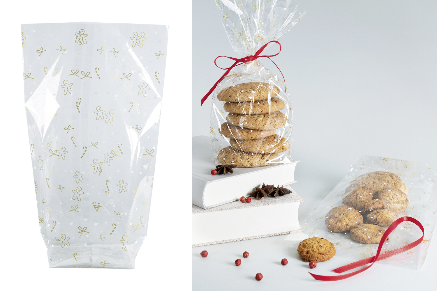 Ces jolis sachets cristal imprimés avec des motifs de Noël blancs et dorés (bonhomme en pain d'épice, canne à sucre, étoiles) seront parfaits pour emballer chocolats, bonbons et autres gourmandises à offrir !