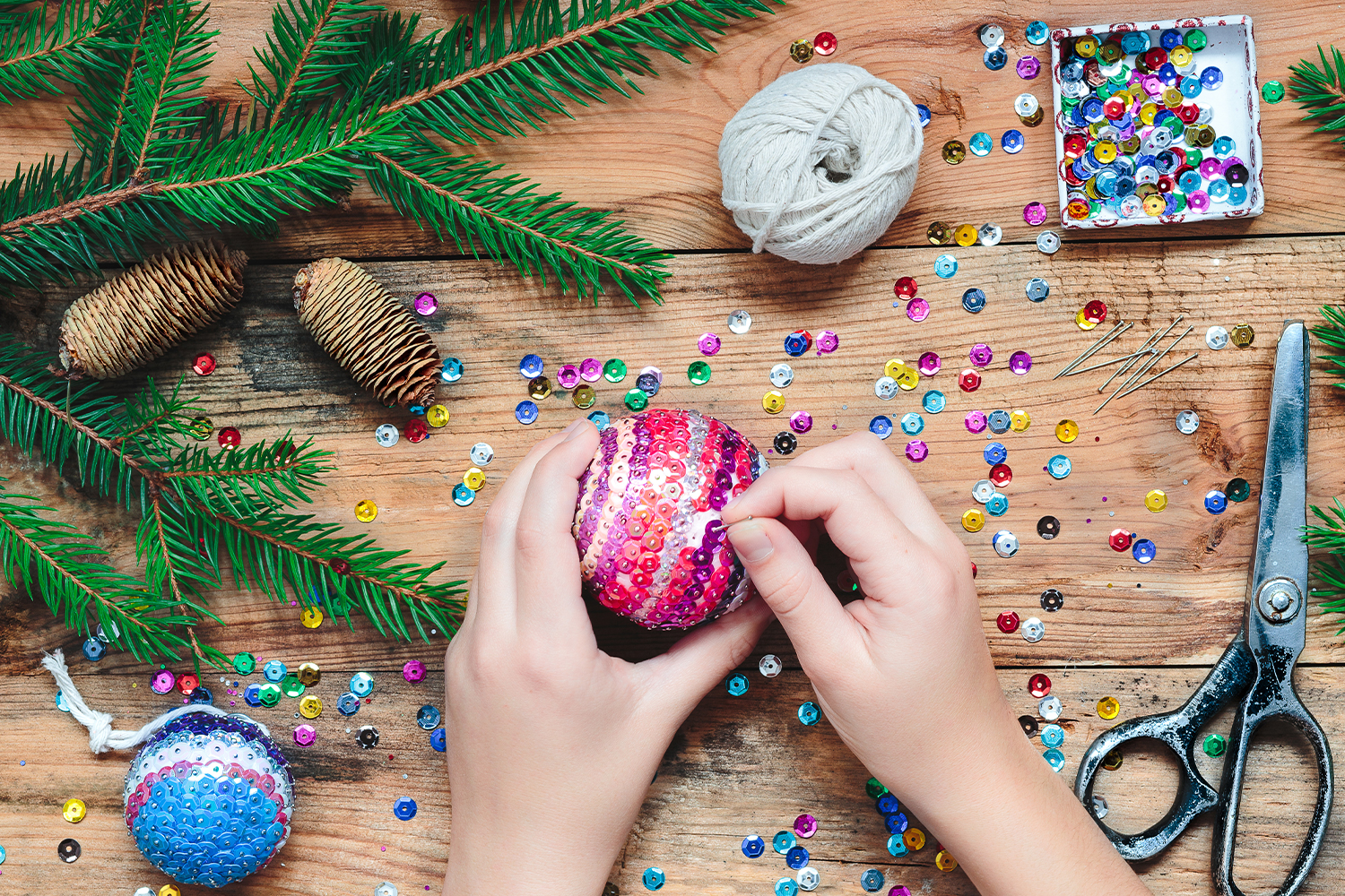 Technique : enfilez une paillette sur une épingle et piquez dans le support en polystyrène. Renouvelez l'opération autant de fois que nécessaire, en prenant soin que chaque paillette chevauche légèrement sa voisine, pour assurer une couverture parfaite de la totalité de la surface de votre objet en polystyrène.