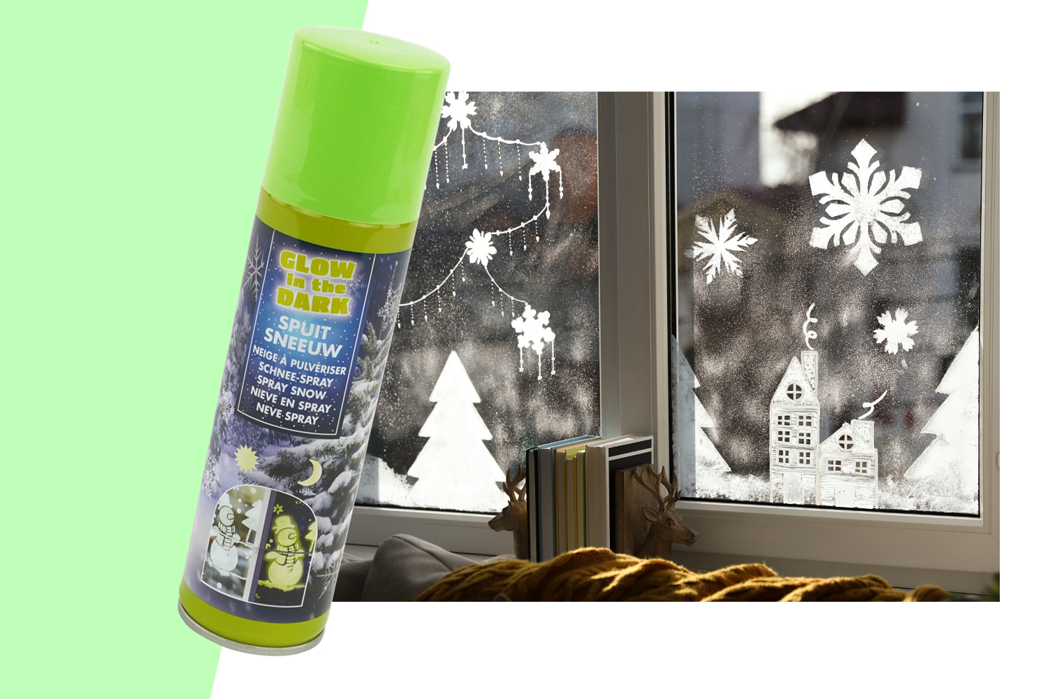En plus de recréer l'aspect d'une neige fraîche, la neige brille dans le noir pour un effet magique. Facile à utiliser avec des pochoirs, cet aérosol transforme vos surfaces vitrées en un véritable paysage enneigé, blanc le jour et phosphorescent une fois la nuit tombée.