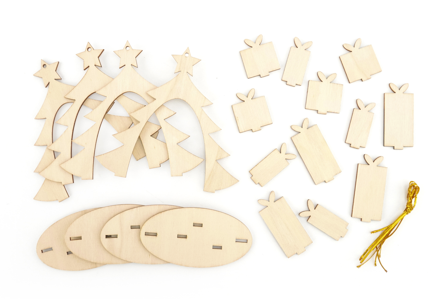 Ajoutez une touche personnelle et festive à votre sapin avec ce set de 4 suspensions sapin et cadeaux en bois à décorer. Chaque suspension est composée de 5 pièces en bois à emboîter pour une prise en main facile.