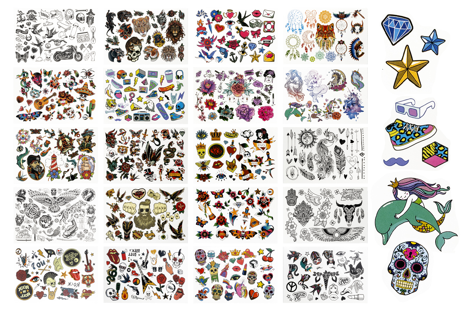 Maxi lot de 20 planches de tatouages temporaires parfait pour les enfants (et les grands !). Avec plus de 400 motifs colorés et variés répartis dans 2 coffrest (bleu + rose), ils permettent de s’amuser, de compléter un déguisement ou simplement de décorer la peau pour une fête ou une après-midi créative. Faciles à appliquer à l’eau et à retirer au savon, ils sont sans danger pour la peau car dermatologiquement testés.
